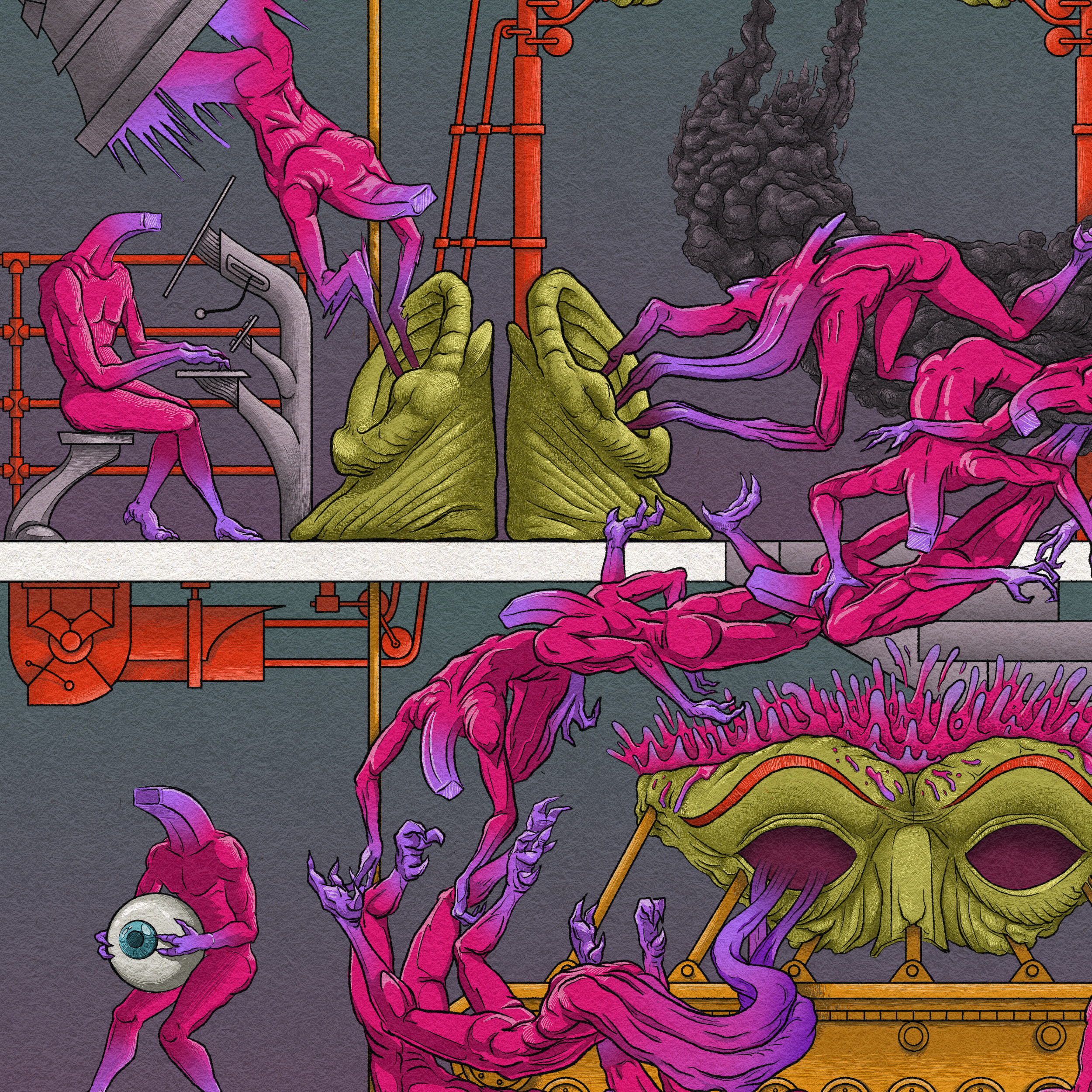 A visual analysis of social pressure and the erosion of autonomy. The piece depicts the systematic reduction of the individual into a functional component within a collective machine. Central to the narrative is the rejection of incoming stimuli — a futile act of resistance against overwhelming external forces. Despite these efforts, the process of instant re-tuning and endless calibration continues, enforcing total integration. It’s a world where the struggle to preserve the self is systematically suppressed by the mechanisms of the collective.